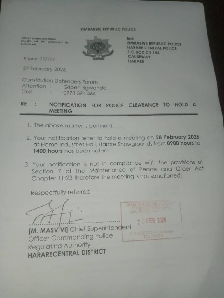 In a letter dated 27 February 2026, Chief Superintendent M. Masvivi, Officer Commanding Police Regulating Authority for Harare Central District, formally rejected CDF’s notification to hold a meeting at the Harare Showgrounds from 0900 to 1400 hours on 28 February.